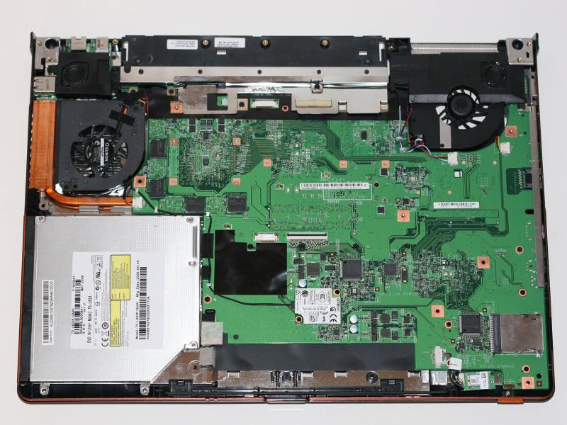 Here's what it looks like under the chassis. The bottom right (front right) gets really warm. I assume that's the southbridge (the interface to the CPU from all the add on components like GPU).