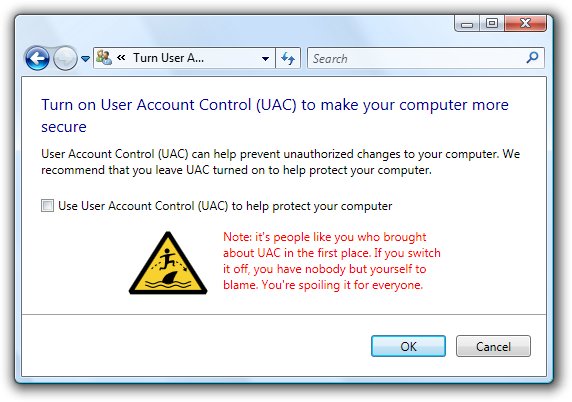 Besides that, here are a few of many reasons that you shouldn't disable UAC...