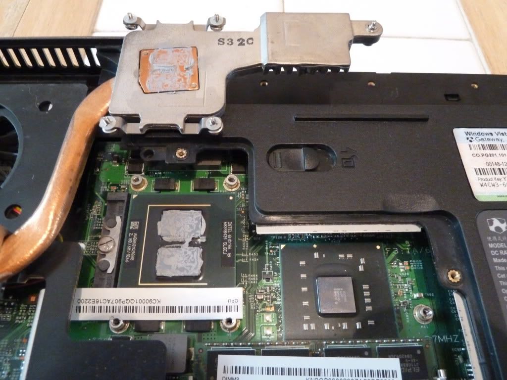 There was some kind of TIM on the processor, but there was nothing on the North Bridge at all. As I got further into the laptop, I also noticed that all 5 of the screws at the top of the keyboard were completely missing as well. I talked to the friend I bought it from and he said he never opened it, so I guess I have Gateway tech support to thank for the 5 missing screws and the missing TIM pad...