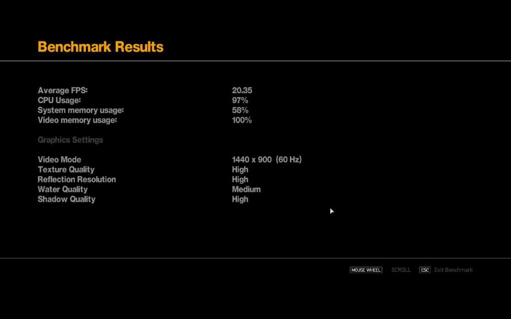 Crysis warhead: I am using ccc lvl 3 dx10 @ 1440x900 with no AA. I used the "Shore_leave" level and started the benchmarks right before I entered the harbor.