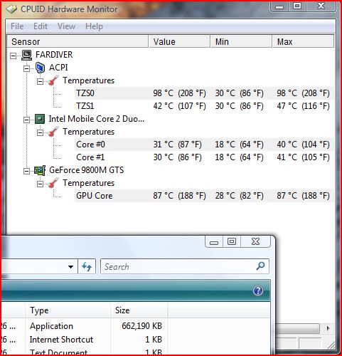 Another thing that happened to me for the first time in a while, was that I got TZS0 to hit 98C for an extended period of time running Furmark and playing chess at the same time. However, it do not downclock the GPU and did not appear to affect the Furmark framerate. Once I killed Furmark, TZS0 immediately dropped to 41C. I'm inclined to agree with E-Wrecked on the source of the problem and at least with the P8400, it does NOT cause a downthrottle of the cpu. So, I'm perfectly happy to just ignore it.