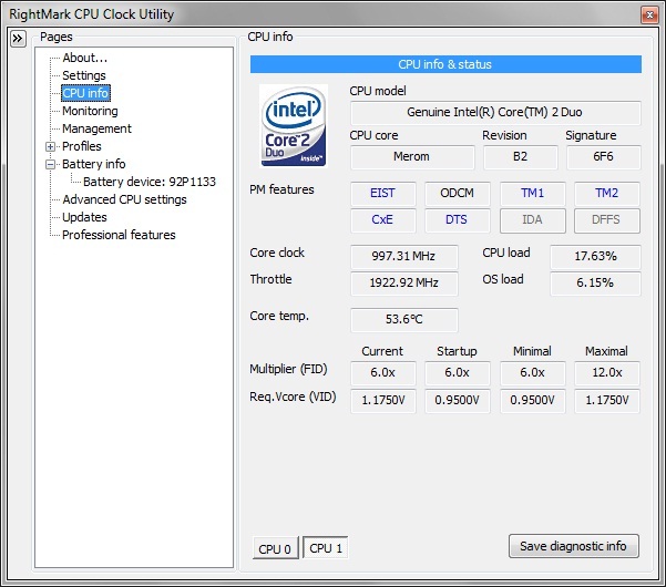 well this is quite confusing. When i just leave it alone i can watch it idle as low as 6.0x .9250v but when i actually get into the program it won't let me go any lower than 1.000v. Which is quite confusing to me as it naturally goes lower than 1.0v but rmclock won't let me make it go that low with it's own thing.