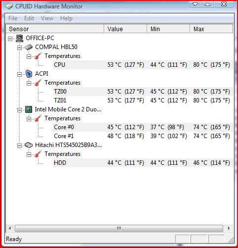 10 mins pushed this little machine to 86C - yes 86C but it performed like a champ and kept going. Fan obviously was going on high and the entire bottom of this laptop has holes everywhere for air intake. I have a fan on my desk that was blowing on me but not specifically on the laptop itself so, about 7 minutes in it hit that 86C peak and stayed there till the 10 minute mark when I ended the test. I was using RMClock's CPU Info page for temp monitoring; I didn't use HWMonitor so, I'm guessing their results would be similar.