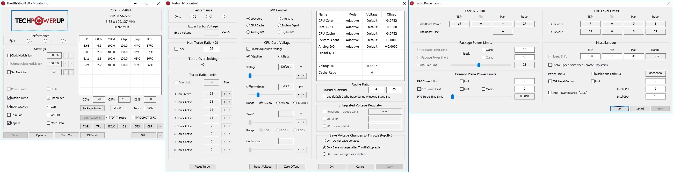 - Disabled Turbo so CPU is limited at 2.7 GHz (when GPU is running the undervolt isn't enough, not a big deal and somewhat expected, I can live without Turbo)