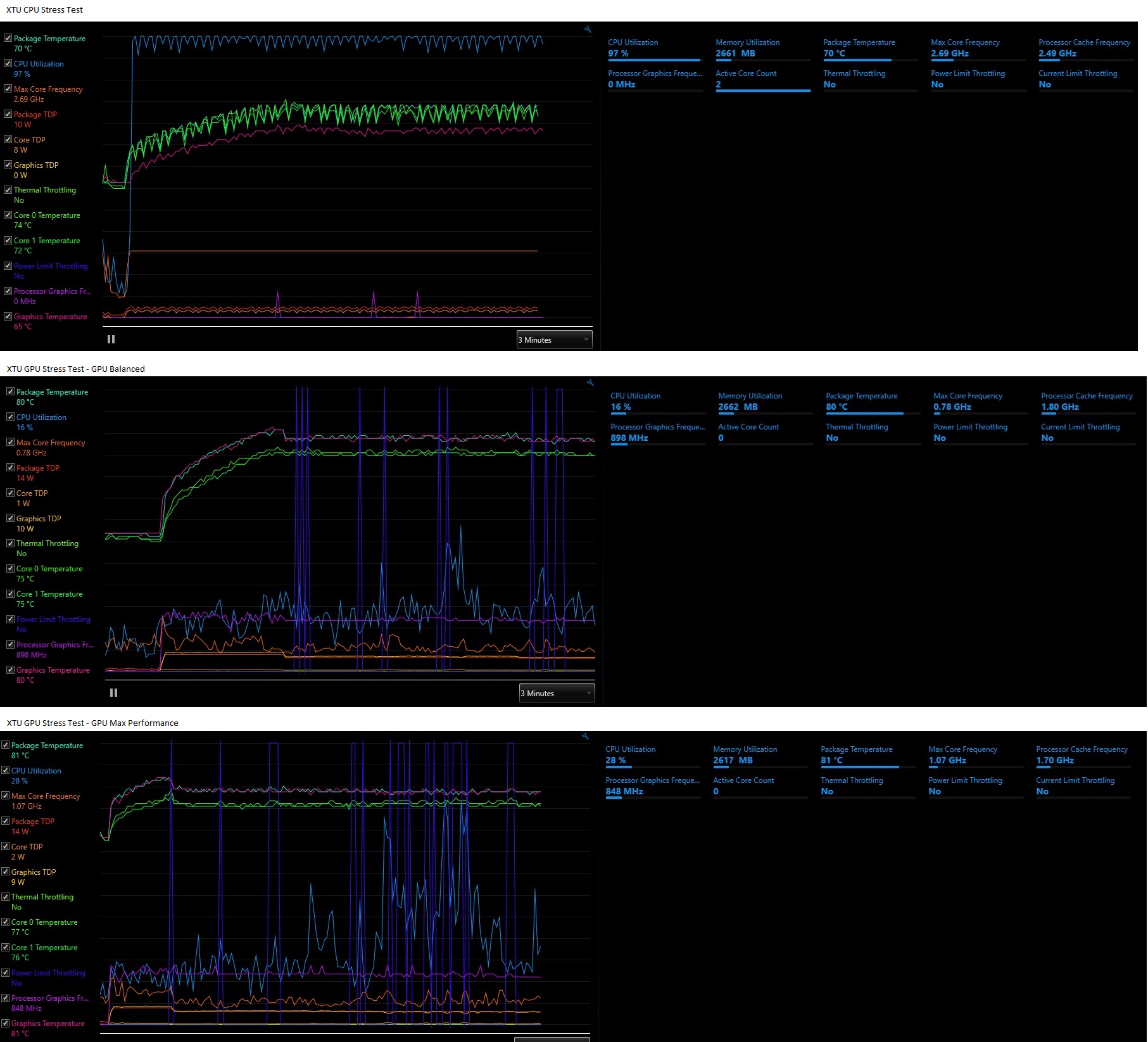 CPU tests aren't an issue at all, XTU reports about 8W for the CPU (although package total is 10W, what's up with that? GPU isn't in use)
