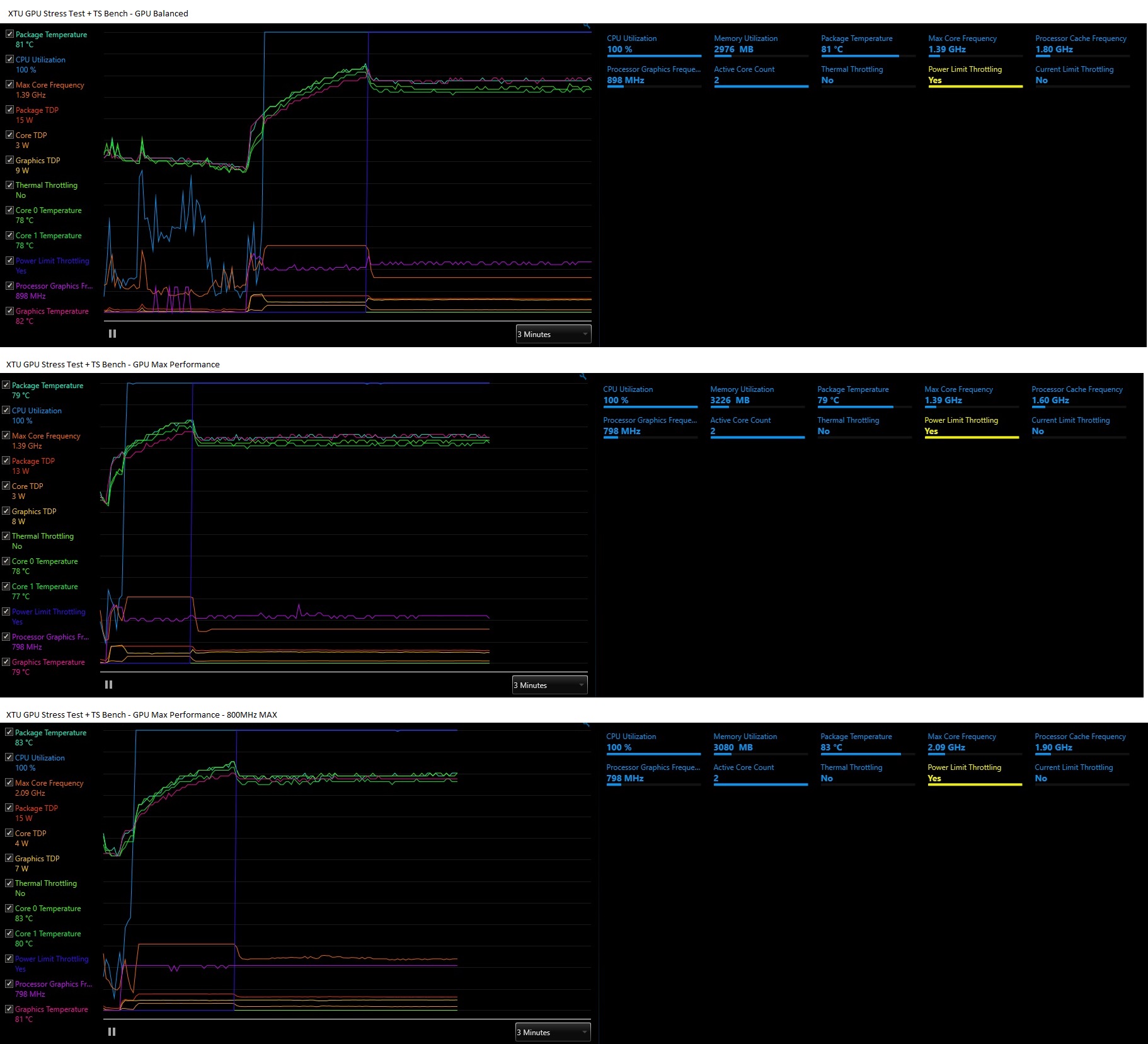 Set it to 800 MHz and ran another GPU XTU stress test + TS benchmark. Great succes-ish, throttling still occurs but instead of the CPU being downclocked to 1.5 GHz now it only throttles down to 2.0 Ghz. This was also somewhat unrealistic so I figured I was ready to test it out in the real world!