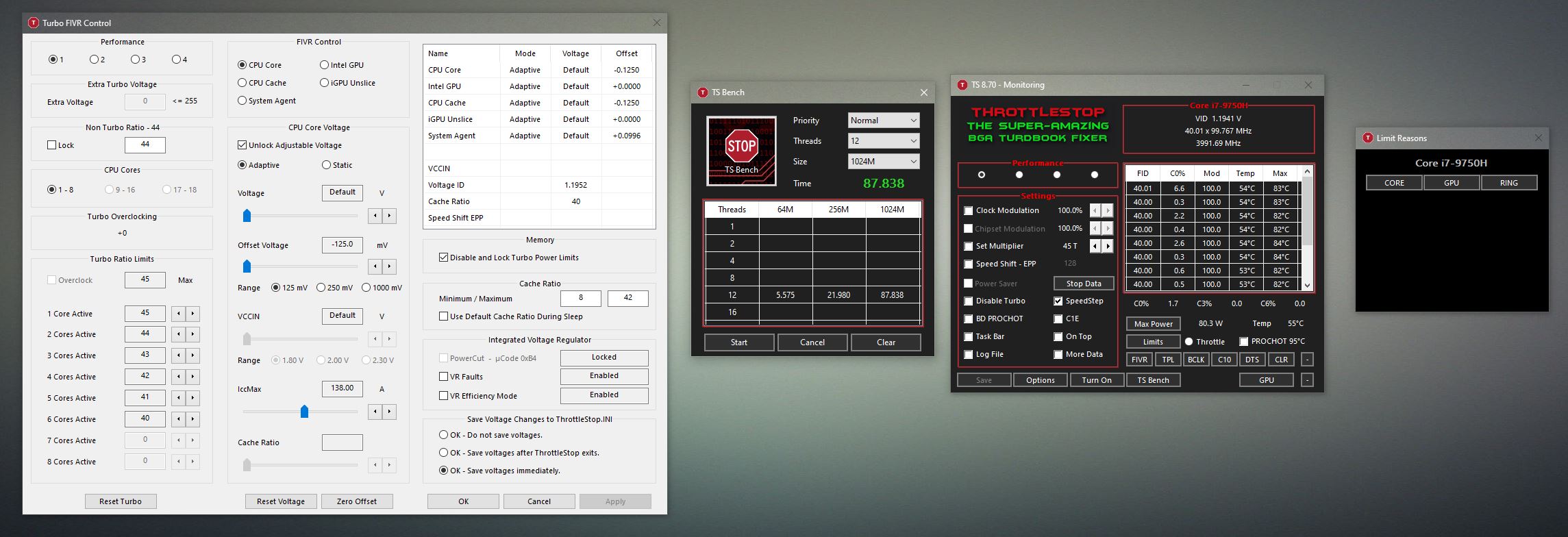 Some say that a -125 mV cache offset with a -275 mV core offset will show the same performance and CPU temperatures as an offset of -125 mV cache, -125 mV core. In this case, maybe the ThrottleStop request is denied and the CPU just uses the numerically lower value for both core and cache. Are there any benchmarks that are repeatable and show a clear advantage of going much higher on the core offset or any specific benchmarks that show no improvement? Perhaps with or without AVX might make a difference.