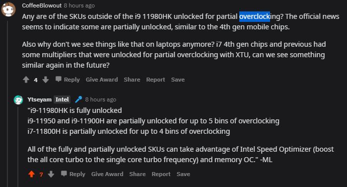 There is an AMA w/Intel Employees over on Reddit that has some interesting information about the just announced Intel Tiger Lake 11th Gen H processors https://www.reddit.com/r/intel/comments/na00cv/ama_with_intel_11th_gen_intel_core_hseries_mobile/