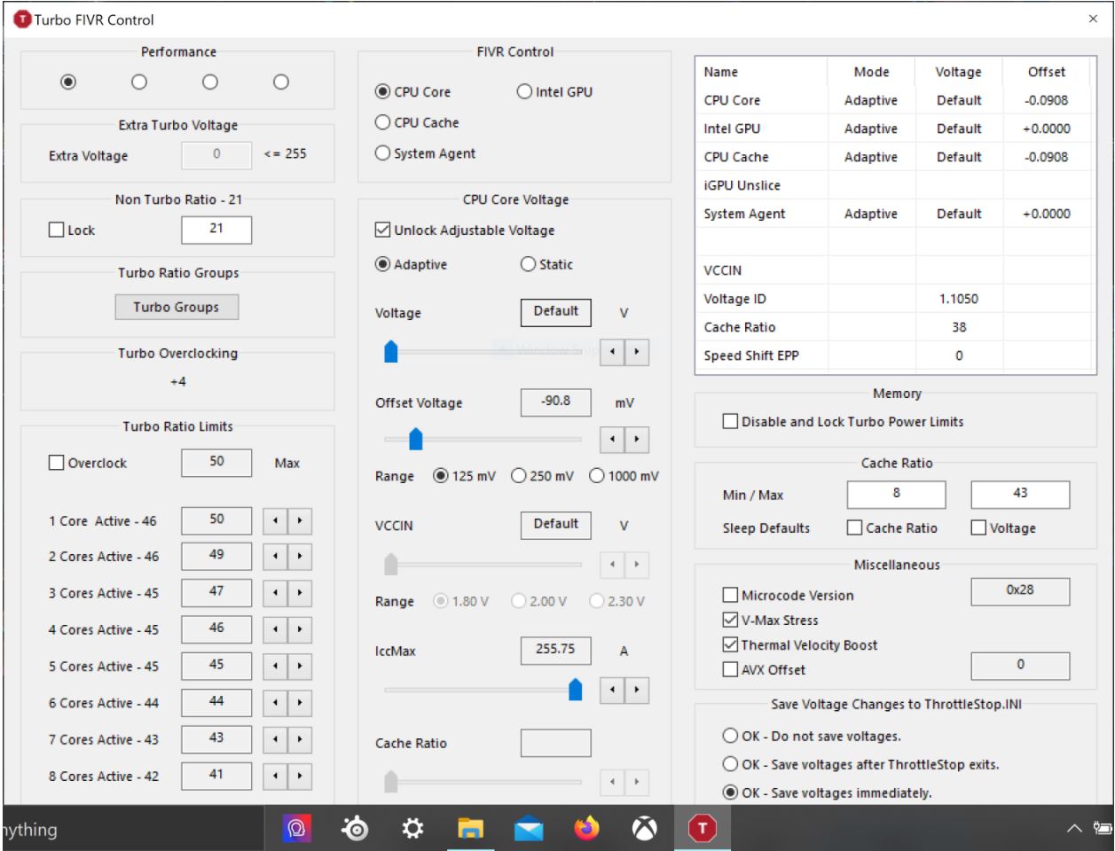 The "ring down bin" is only in the new TS version I guess right? Because at the moment I have the "thermal velocity boost" checkbox in that place. Moreover I'm wondering: does that setting overrides what you set in the FIVR cache window? Because I've never tried to give the cache the same ratio as the cores. I've always found that limiting the cache ratio to lower values granted way more stability. I have my cache limited to 31x while cores can get to 38x or 40x in my OC profile but now I'm asking myself if that's too much of a difference.
