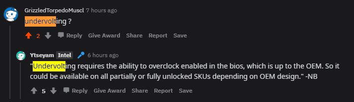 "Undervolting requires the ability to overclock enabled in the bios, which is up to the OEM. So it could be available on all partially or fully unlocked SKUs depending on OEM design."Vistar Shook, FrozenLord, Vasudev and 2 others like this. -