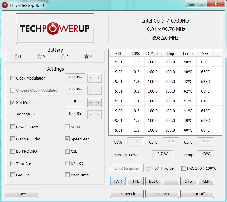 @DackEW - I think my Skylake desktop CPU can also run at a steady 8 multiplier so perhaps the mobile Skylake chips are a little different. When your computer is idle, what C States does ThrottleStop report? I wrote some code to detect the newer C States like C8 / C9 / C10 but so far, I have not run it on any Skylake hardware. I know the low power Skylake U CPUs support these C States as long as the bios enables them.