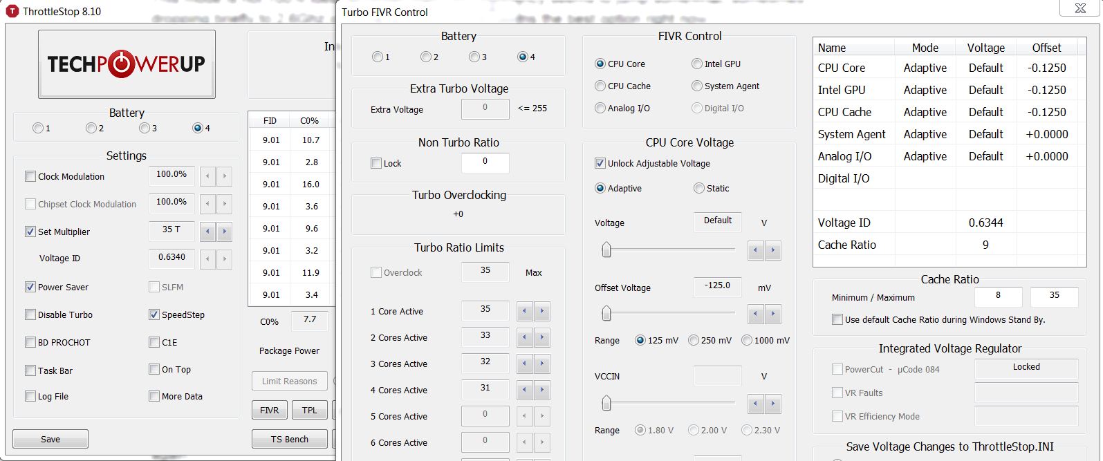 In Throttlestop I have now different profiles for battery, browsing, gaming and for benchmarks and the laptop runs really awesome. I did undervolting too and woww the results are shocking! The CPU was stable even at 0.18V offset. Running Linx64 the laptop's peak power consumption measuring from the wall dropped from 81W to just under 60W. That is huge difference! If I play GTAV locking the CPU at 1.8GHz, the temperature will not go over 62C, while the room temperature is 29C.