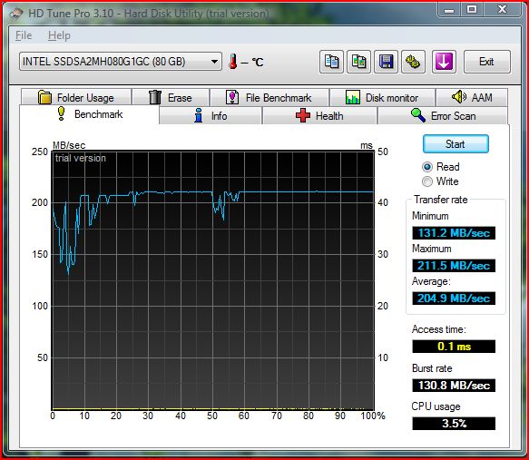 Vista installation went very quickly -- 15 minutes at most. Installed all bootcamp 2.1 drivers and re-ran ATTO and also ran HD Tune with the Intel SSD as my boot drive. Here are the results: