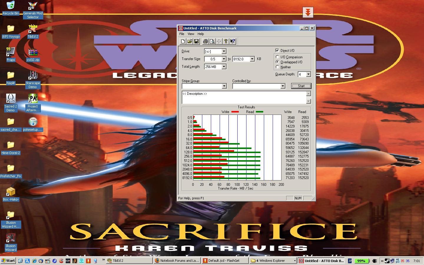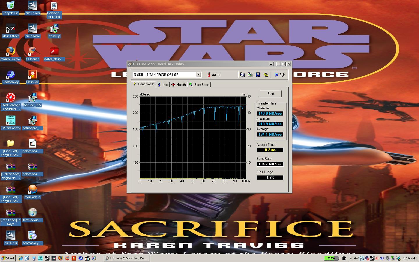 Here are the Hdtune, ATTO, Hdtach scores on my G.skill Titan 256 GB SSD. This drive is running as the system drive. Even though HDtune reports the drive as having a temperature the drive doesn't feel warm. I installed adobe reader 9 and it took 2 seconds to install. I was playing a game and running fraps and I didn't notice any stuttering.
