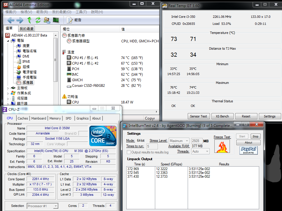 CPU is Intel Core i3-350M. The clock is 133 X 16 => 2.26GHz, L3 3MB, dual core and supports HT technology.