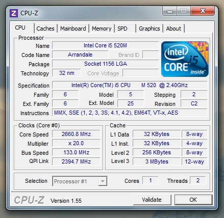 Here's the CPU-z readout. Notice that the processor selection is greyed out and that the speed is 2.66MHz. I have no tasks open now except Firefox and CPU-z. Grrrrr