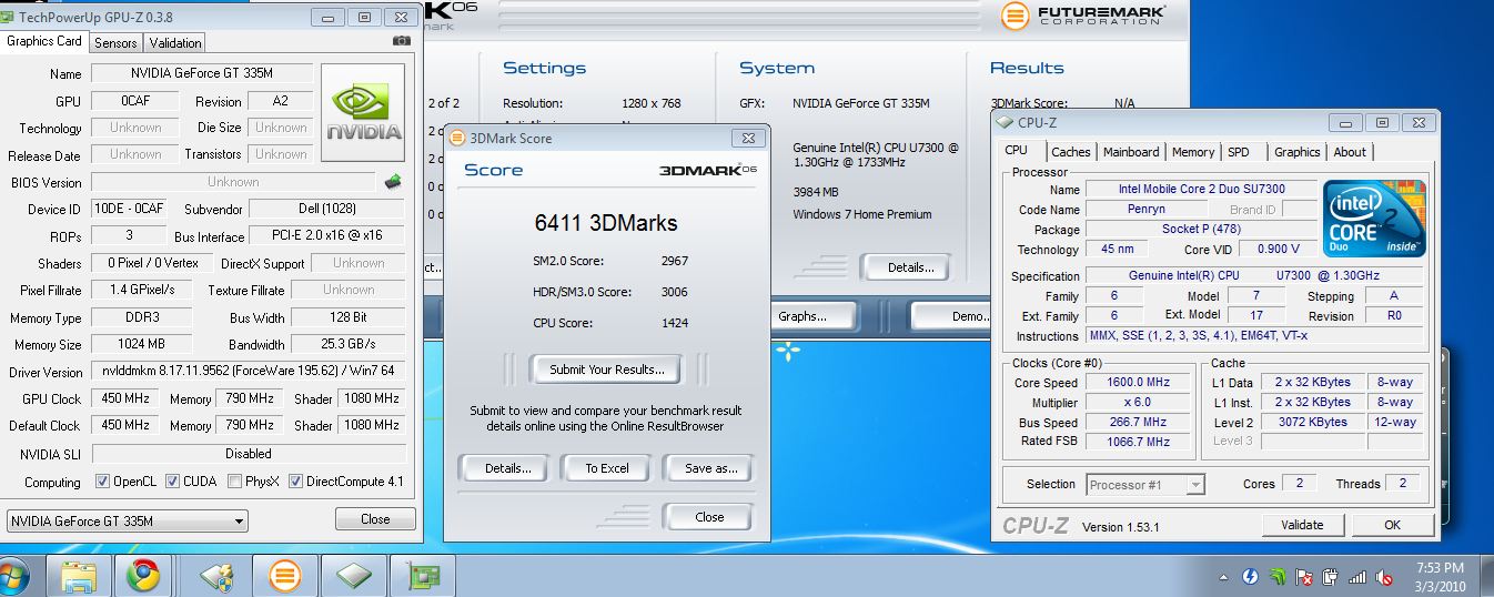 If anyone cares for comparison numbers, here's stock clocked 335m. The SM3.0 score is the same but the 2.0 on the 335m is higher - though not sure how big of a difference that really is. Looks like the CPU is what's helping the 3dmark06 score which is what I expected. nice nice