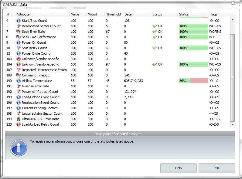So it seems that these temperatures are quite average in contrast to the experiment BennyPac took. However, I ran Ashampoo HDD Control yesterday and got the health result of my hard drives with the help of S.M.A.R.T. data. The results were this:
