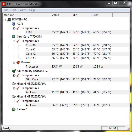 I have the laptop on a stand that gives complete free airflow to the intake fan, and raises the back of the laptop around 6" clear of the desk. This makes a huge difference. When I have the laptop flat on the desk the temps are around 10°C Higher after 10 mins or so as the hot air starts getting sucked back into the machine.Code:Hardware monitor ACPI Temperature 0 50°C (122°F) [0xCA0] (TZ01) Hardware monitor Intel Core i7 720QM Power 0 15.34 W (Processor) Temperature 0 48°C (118°F) [0x34] (Core #0) Temperature 1 47°C (116°F) [0x35] (Core #1) Temperature 2 51°C (123°F) [0x31] (Core #2) Temperature 3 46°C (114°F) [0x36] (Core #3) Hardware monitor ATI Mobility Radeon HD 5850 Temperature 0 51°C (122°F) (GPU Core) Hardware monitor Hitachi HTS725032A9A Temperature 2 36°C (96°F) [0x24] (Air Flow)