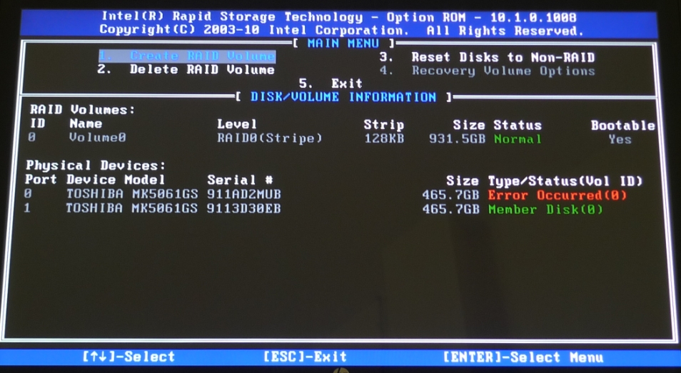 The third capture with the error is one I am all too familiar with. It drove me crazy for a while, until Intel released new RAID drivers. My error was always in Yellow...I am not comfortable with the RED message...it seems to be one of more than caution. With that said, even with the error message, I was able to use my machine. Intel Rapid Storage manager has an option to reset the message as well and turn both drives back to green, as long as it is not a major hardware malfunction, in which case...it will return pretty quickly. This was a few years ago, when Win 7 first came out. It could also be one of the drives is not performing correctly.The drivers have not been an issue for a while, so my suspicion is one of the drives is NOT quite right. If you can break up the array and test each drive individually...might find an answer. I have two WD Velociraptors in RAID 0 on my desktop and these errors started like this because of drivers. Later, when the error occurred again...one of the drives went out of commission and had to be replaced. I have never seen a Toshiba utility to test the drives, but there is one from HP built into the machine. Testing the drives is going to take a long time, but see if there are error codes. Those codes are the ones that technical support can identify....