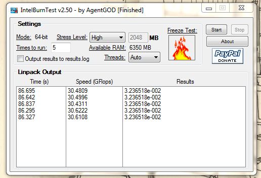 Based on Cam's post about IntelBurnTest 2.5. I downloaded it and ran in standard and High mode. 2630QM. Once I started the test...the processor kicked into Turbo mode and NEVER slowed down. I have Coolsense set to Performance on both power and battery. With that said...here is photos from "Standard Mode"