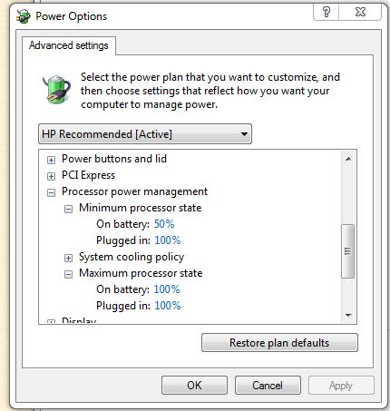 I know that HP created the Power scheme in control panel...How many of you have readjusted it? The original settings were something like 5% / 50% minimum and 5% and 75% maximum. My desktop i7 950 is at 100% / 100%. I set my Envy close to the same as desktop, except if it has to throttle down, then I allowed 50%. At 88C, my fans were blowin hard, though nowhere near as loud as my desktop can get with high temps. The minute the Intel Test was done...I saw almost an immediate 15C drop followed by temps dropping into the 50s range within 10 seconds. Coolsense works...but I think it is a combination of that and telling windows power applet NOT to throttle the processor
