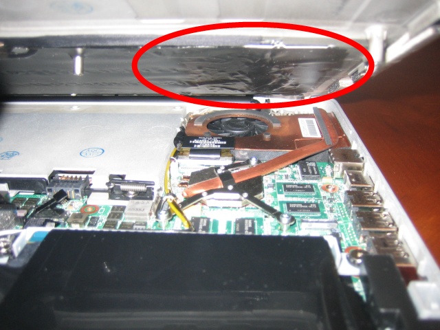 The second picture is a close-up of the GPU fan. There were no loose cables touching the fan blades. Right above the fan you can see air bubbles in the plastic that covers the underside of the keyboard. That plastic can touch the GPU fan blades, especially if you press down on the keys in the upper-right hand corner of the keyboard.