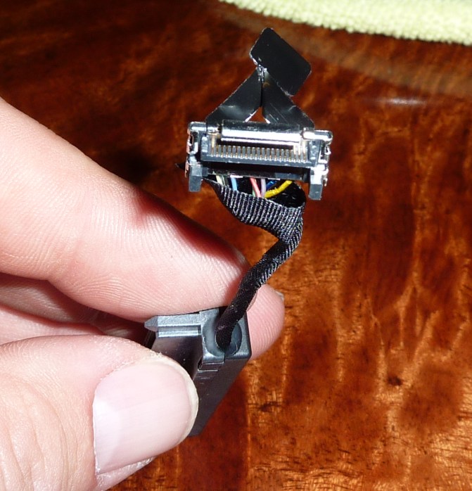 . Once the socket is unlocked, the tension of having the keyboard raised should pull the cable out of the socket. Reinstallation is just as easy. Seat the black cable into the socket and press down on each side of the brown socket lock. You will feel and hear a slight click when the lock is down securely.