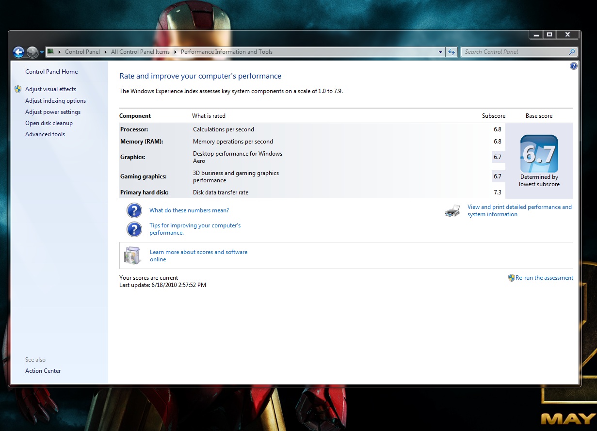 My WEI for my CPU is now 6.8! My overall WEI is 6.7 being held back by my GPU as seen in the attached pic below
