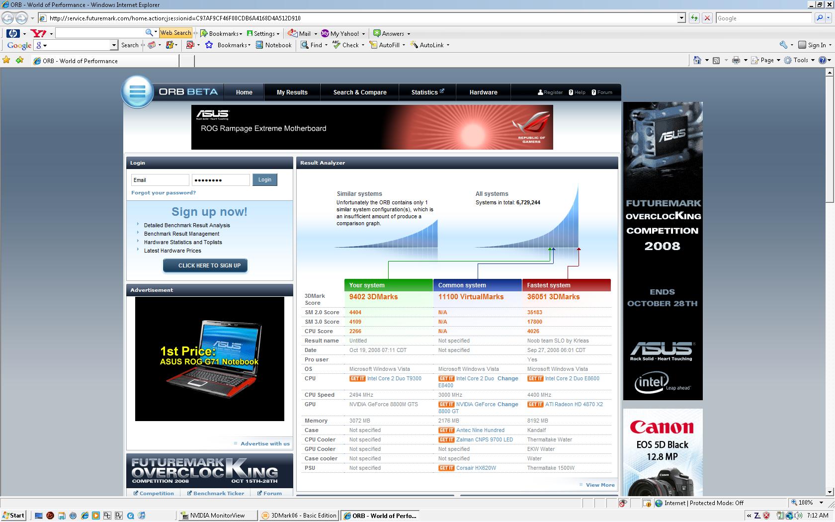 I also ran 3dMark06 (free version), using my stock settings, 600/950 (JohnnyFlash's settings minus shaders cause I don't use riva tuner), and 625/925 (my normal overclock). Screenshots are also attached. Scores: