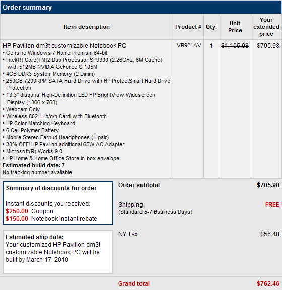 I got the exact configuration except I got an extra ac adapter instead of the 500GB HD. I also added the $6 earbuds for a coupon. My before tax total was $705.98, after tax, $762.46. I'm happy.