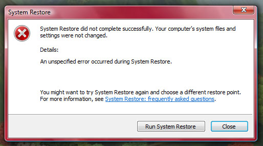 8. We can always try a system restore - tried that, but the restore itself failed (a screenshot is attached)