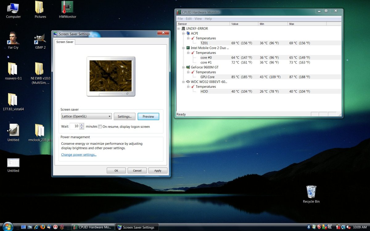 Here's a couple of screenshots of my temps, using HWMonitor (note max temps). The first was from last night, running 3D screensavers for about 15 minutes on my kitchen table (tile top, it seems to reflect heat back upwards). The second is using the same screensavers, but this time on my kitchen counter, which doesn't reflect heat as much. Plus I used 2 coasters to lift up the back, instead of just one (coasters about 1/4" thick).