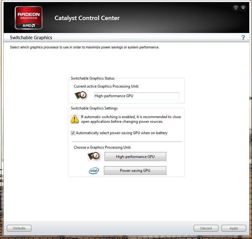 I can even disable automatic switching and leave just the AMD card to do everything. That would entail having AMD card on battery, too. With switching, I get 3.5 hours on six cell battery with brightness on 6. On power, I keep brightness on 7. Nine cell giving over 5 hours of battery time for some. Mind you...the Envy 17 3D (model I have) only comes with 1900 x 1080 screen. Some have kept just the ATI card and reported about 2 hours 40 min battery time. Here is the manual switching screen. Whether you have an Envy 17t-2000 or 2100 series...you have power over the graphics switching...