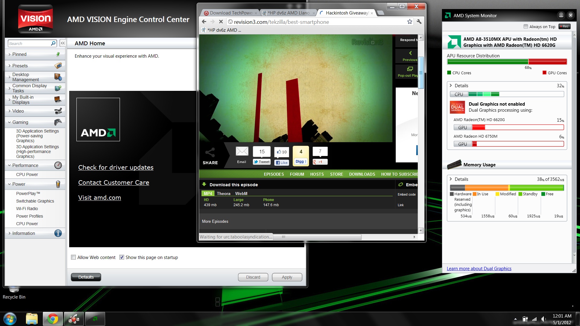 For instance, where other than here, have you ever heard a one of them, note that it is a relatively trivial matter for an a8 35XX to achieve 2200ish in 3dmark11? One of the biggest errors people make vis a vis xfire/dual graphics performance is not keeping in mind the limits of the cpu/igpu sharing of resources when trying to configure for max performance. The controlling algorithm is NOT THE SAME AS INTELS!!! Let me say that again, it is NOT THE SAME AS INTELS. Accordingly, your core settings are different. Fortunately, the combination of K10Stat and Fusion Tweaker, permit you to optimize the cpu's core performance while minimizing its *perceived* capture of resources (perceived by the algorithm). Roughly put, if the algorithm perceives 'available' resources, it will direct same to the gpu. The more frames the igpu can generate, the more it will correctly interleave with those generated by the dedicated. Xfire/Dual graphics can give you 175 (roughly)% of what the igpu can do. (its actually a bit higher on a finely tuned system) Output is effectively dependent on Igpu output so anything you can do to increase that , contributes massively to total output. I hear a lot of talk about the appropriate dedicated gpu for a LLano/Trinity system. If you are planning on building a desktop system, the *sweet* spot is going to be a dedicated one level higher than you would otherwise calculate, for two reasons: