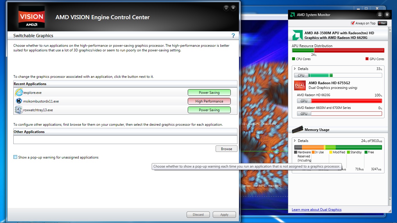 OK, got HT's linked HP driver installed, 12.1a installed. Kombuster running in DX11 mode, set to High Performance. Still, no matter what I do, I can't seem to get Kombuster to use the 6750. Still, when at default clocks, AMD system manager dhows 6755g2. But when I apply ANY change in Afterburner, system monitor splits the dual graphics to the 6620 and 6750. Either way, ONLY the 6620 gets stressed.