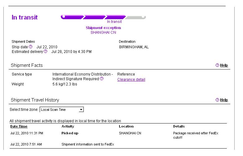Jul 22, 2010 11:31 PM - Picked up - SHANGHAI CN - Package received after FedEx cutoff