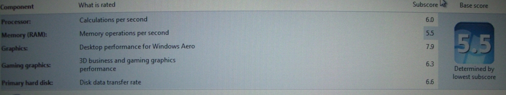 Surprising results. I thought the 64-bit OS would have produced a higher score than the 32-bit. The new windows rating is 5.9, higher as expected: