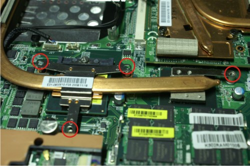 3. (See Pic 2) These are your targets. The CPU, in the lower left, and the GPU, in the upper right. (See Pic 3) You'll have to remove the fan to get to the heatsinks. It's held down by 4 screws, they're highlighted on the pic.