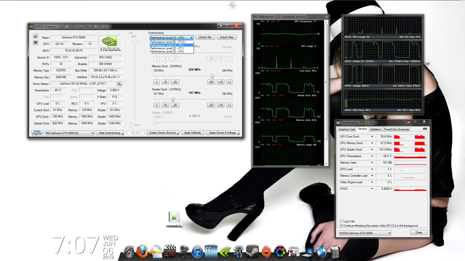 I attached a pic of what my card is doing and wondering if those graph jumps are normal, I also showed the 4 choices nvidiainspector offers to clock. Also the before, and after Screens XoticPC sent me with my system using 3Dmark. I dont know if its working that well now, but all my games so far seem ALOT smoother and my max temps I have hit are 78 in GTA4 maxed full out and fps was steady 34-43 (mind you I did have to fiddle with the view distance and detail sliders for a sweet spot). Saints Row the Third I cant seem to get more then 32fps on full, Just Cause 2 is also running great getting between 32-38fps. I was up till the wee hours of this am fiddling with everything so im not sure if I was OC'd when I tried the games last night but I know for SURE P1 was NOT pushed or lit up, I'm reverting everything to default right now and gonna do in-game tests to see whats what then I'll try with P1 enabled to see if anything changes, I will keep all OC tools disabled while I do this so no confusion.Attached Files: