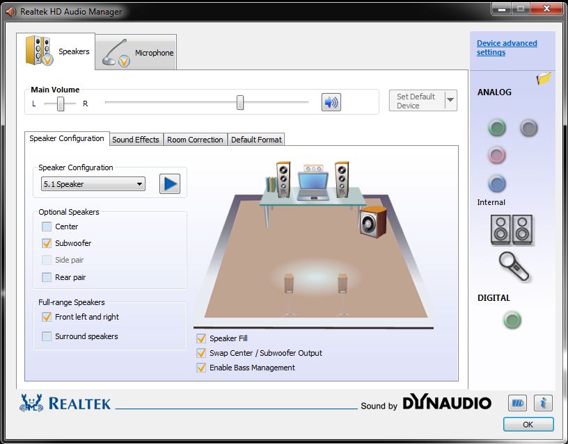 For testing the notebooks Dynaudio speakers and Subwoofer I set the Realek Audio Manager to 5.1 since it lacks a 2.1 setting and check/uncheck relevant items.The test sound emitted when clicking on each of the front 2 speakers and the subwoofer should be nearly the same in loudness.Attached Files: