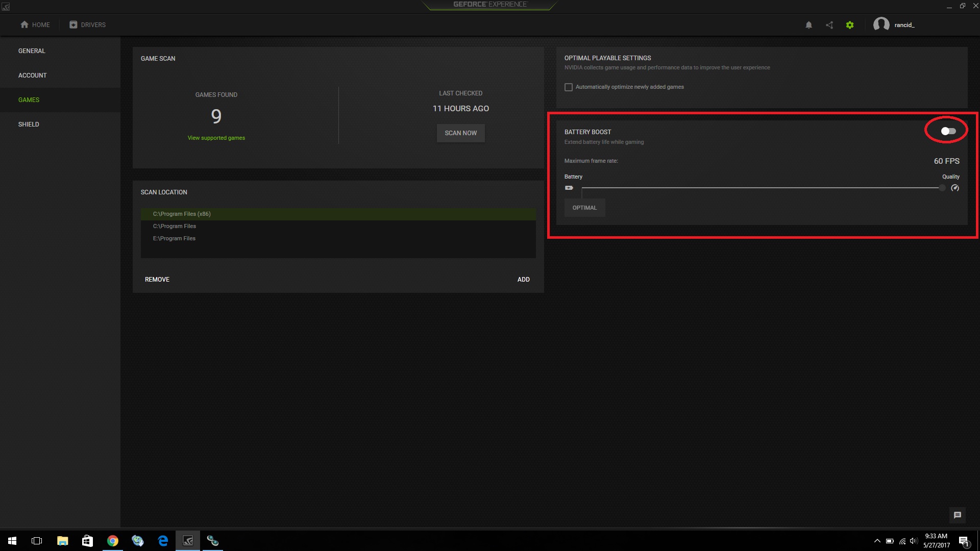 My friends, I present to you the setting that caused me hours of headaches with this laptop (found another thread here on NBR). If you happen to run anything like emulators or light games on battery, TURN THIS OFF! It is inside the Geforce experience hidden under the "games" tab. I set it to 60fps at first but decided I didn't want Nvidia managing anything for the battery and flicked it to off and all my issues went away. I also am seeing almost double the frames in Nier on the battery now and all emulators are running butter smooth.