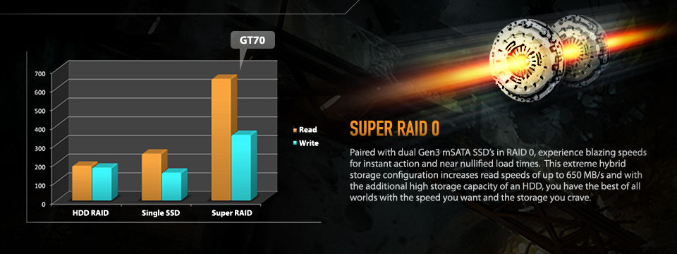 Continuing the unique design elements of MSI's G-Series notebooks, the illuminating MSI logo, which symbolizes the GT60's uniqueness, expands outward. With clean flowing lines and a beautiful black finish as a base, the fiery red lines act as visual ornamentation symbolizing a sensation of extreme speed, giving the G-Series a sense of flawless perfection. Using IMR technology, the GT60 is not only strikingly beautiful, but is also more comfortable to the touch. With a glossy, high-end texture that is scratch and wear resistant, it also serves as the notebook's ultimate protective layer."
