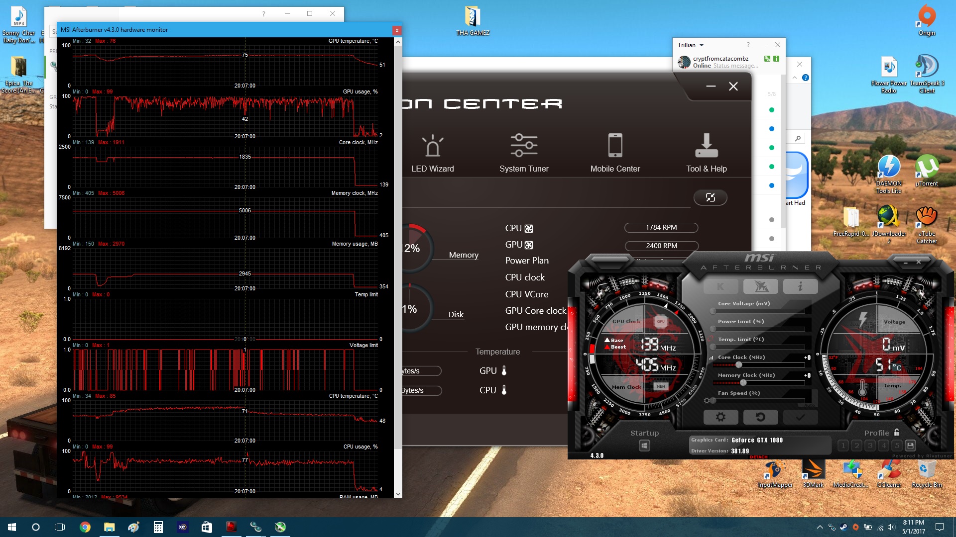Hey guys would like to ask you, because i am really ****ed up and have no ****in clue what is happening with my MSI GT73VR 6RF - Have here 1080 gtx, and today got the same problem as before and have no idea what is cause it. Using a lot of MSI dragon center and switching modes between, SPORT and COMFORT,sometimes using TURBO, but not so often. Today i changed my cooling pad fornew one, so changed only usb connections what i have here (mouse, pad and hdd) and switched from SPORT to COMFORT. Switched off pc and went to work. When i came back, started laptop switched back to SPORT and started play BATTLEFIELD 1. Did not have any issues yesterday and today morning, until i came back from work again. My GPU usage is dropping so much down, so movement and basicly whole game is stuttering, cpu were ussualy used from 60 - 80% during gaming now i have aprox 60 sometimes to 80% but no so often. Have again 20 fps lesser then before and i have no idea what is going on again. Had this problem before, sent my laptop to repair center. They change new gpu, motherboard and fan, but i am for sure, so there must be some ****in soft ****. CPU frequencies, temperatures, clock just liek usualy. In nvidia control panel have set up power management on maximal performance, which i had before today.