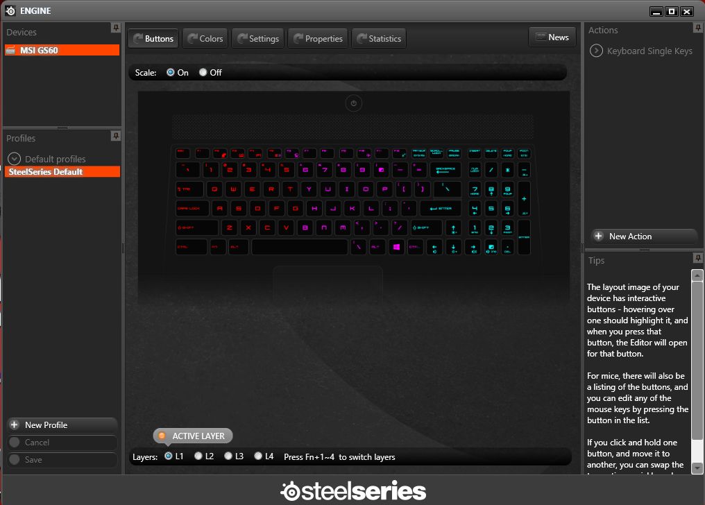 On Windows 8.1 I simply click on the Steel Series Engine Tile and it brings up the screen shown in my previous post.There I can change the level(keyboard lighting color combo) by pressing the FN key plus numbers 1 to 4 to switch "layers".