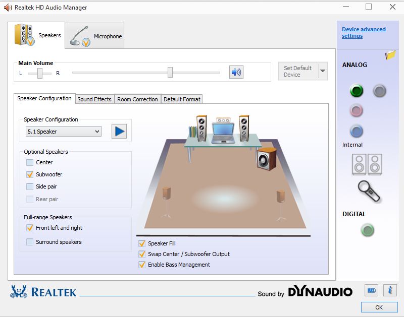 The clean install and the MSI Realtek HD Audio driver allows a Audio Manager drop down menu with 4 choices.My screenshot above shows my 5.1 selection and tweaks. -