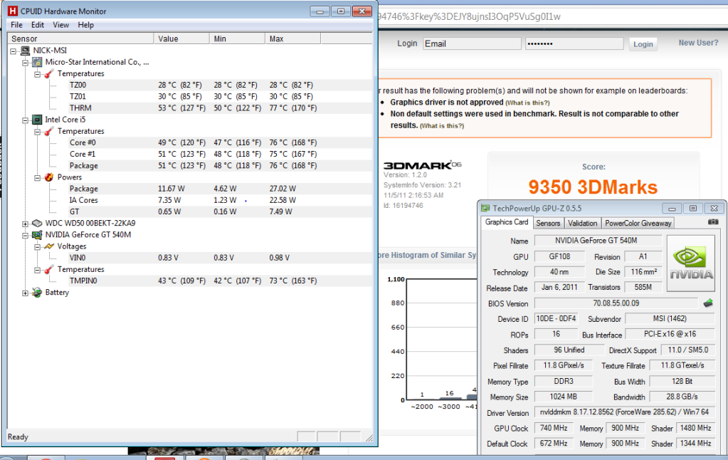 As for GPU overclocking. I seen what you did. and that was something amazing. But if you can do that on this 540m GT gpu, dont you think that the same goes for 550m GT? I mean if you see both the GPU design, 96 pipelines, memory speed, memory bus width they are practically the same card with stronger cooling system provided for it. dont you think that you can do a lot more with the said card? one could say that just use laptop coolers when it gets too hot. then it defeats the purpose of that 0.3 inch advantage or the 0.5 pounds advantage. I believe that those people who bought this particular model of Msi decided on buying it because they want that harmony of being able to play games and carry it around without being planted to wall socket all the time. And after you overclock it, your battery life sank too. so much that the lenovo becomes the one who has the longer battery life. you said that you get 5 hours battery life while doing web browsing. did you use your overclocked gpu while just surfing the net or have it act hybrid or turn it off completely? -