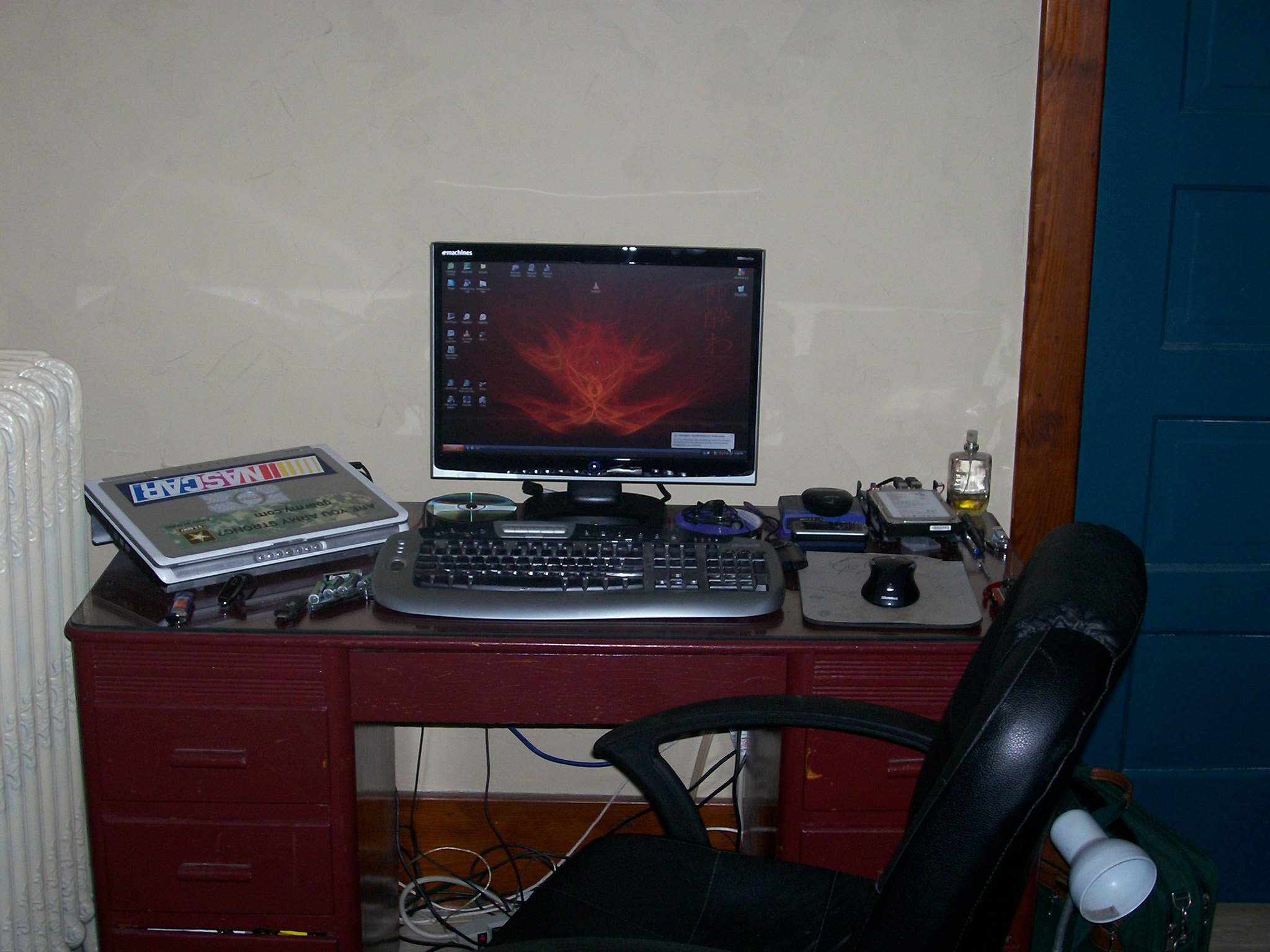 Need more LIGHT! It'll help your eyes. Anyway, great setup. Love the 'surrounded by tech' feel.