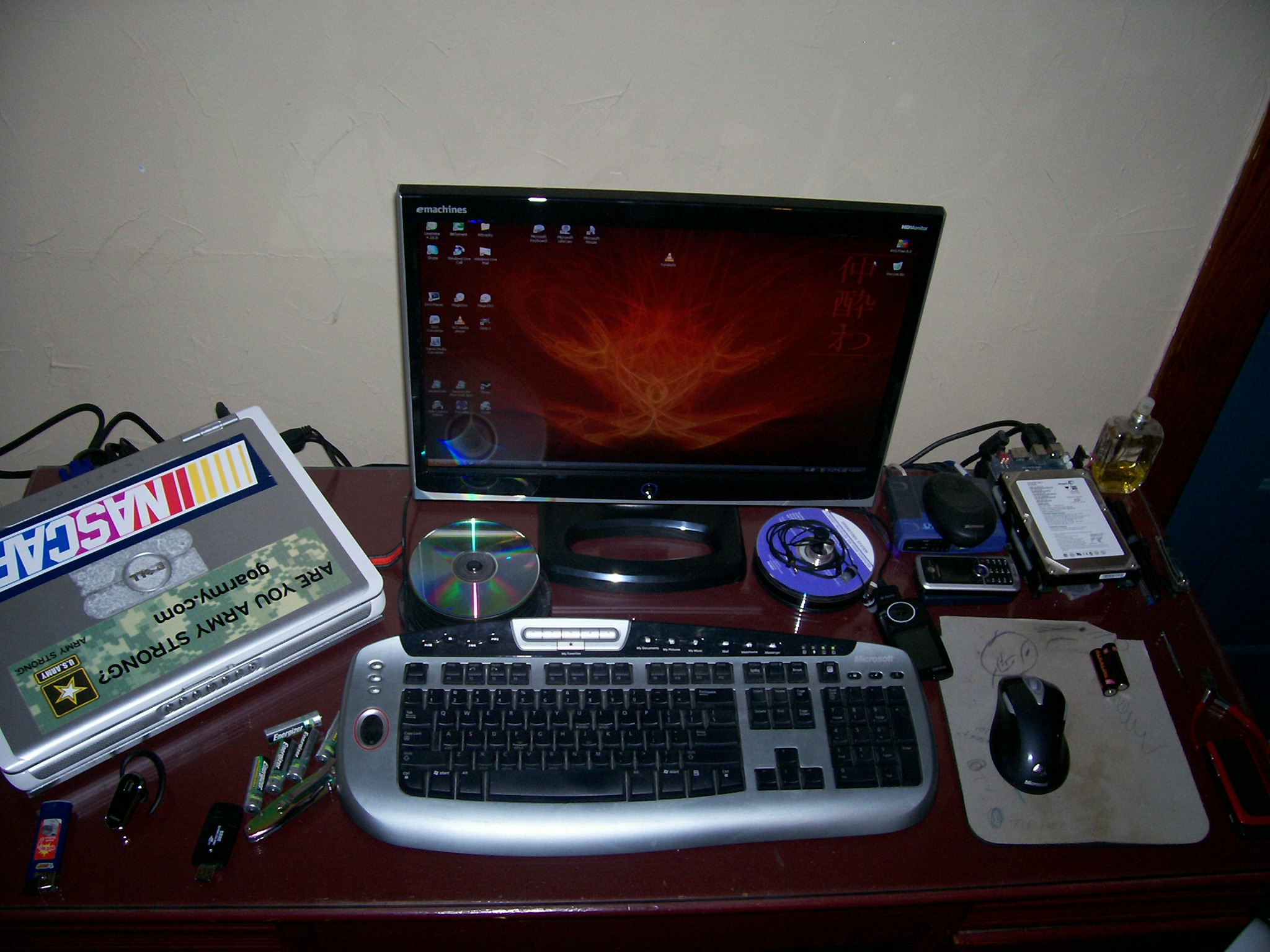 Specs if you're interested: Dell E1505, Core Duo T2600 2.16ghz cpu, 2gb DDR2 533mhz ram, 80gb 7200rpm HDD, DL DVD-/+RW. The screen is a 19" emachines/gateway monitor that I picked up for real cheap at a local staples.