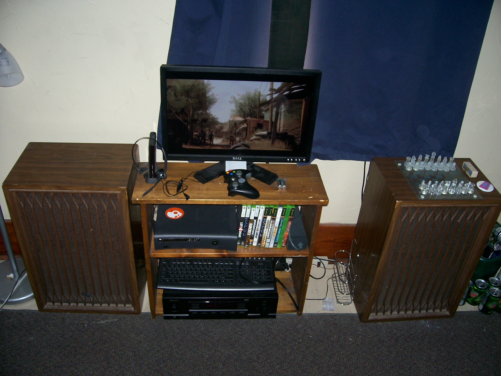 The Xbox is a 360 Elite, hooked up to a Dell 22" LCD and sound is supplied by an old Sherwood stereo receiver that outputs to two Kenwood KL6090 speaker cabinets.Attached Files: